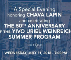 New York, NY – The YIVO Institute for Jewish Research presents a special evening celebrating the 50th anniversary of the Uriel Weinreich Summer Program and honoring Chava Lapin for her lifetime commitment to Yiddish language and teaching. The evening will take place on July 11th, 2018 at 7:00pm at YIVO, located in the Center for Jewish History at 15 West 16th Street and will begin with a buffet dinner, followed by the program.
