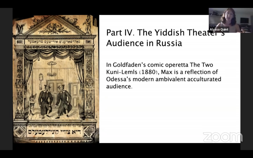 The Accidental Rise of the Modern Yiddish TheaterAired: July 23, 2020Lecture | Alyssa Quint explores the particular social, commercial, cultural, linguistic, and historical circumstances that gave rise to the first public performances of Yiddish operetta in Romania and Russia from 1876 to 1883, a period considered the first chapter of the modern Yiddish theater.