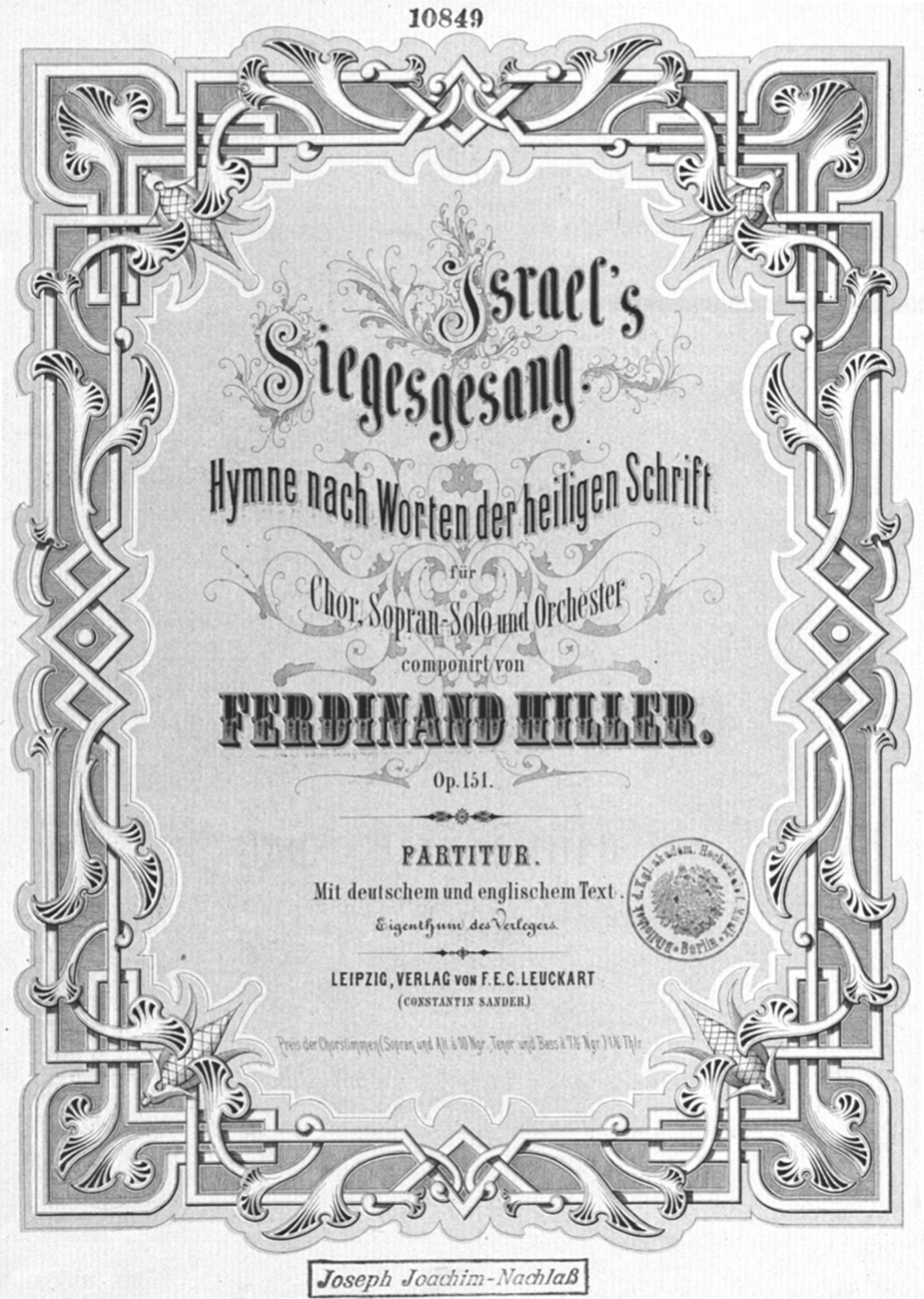 German composer Ferdinand Hiller (1811-85) lived and worked throughout a period of tumultuous change, marked by unprecedented movement (both geographic and socio-economic), active assimilation, and formalized emancipation for the Jews of German-speaking Europe. A piano prodigy and student of Hummel, he was a direct contemporary of Felix Mendelssohn, with whom he was personally and professionally close. Hiller, who was baptized at the age of 29, had a complex engagement with Jewishness and Judaism, which has thus been variously essentialized as a pervasive part of his identity to mere circumstance of birth, ignored and forgotten. Of several compositions explicitly engaging with Jewish texts, his 1840 oratorio, Die Zerstörung Jerusalems, was a widely acclaimed success throughout Germany and beyond, whereas Hiller’s eight-movement choral work, Israel’s Siegesgesang, op. 151 (1871) had a more modest initial reception.