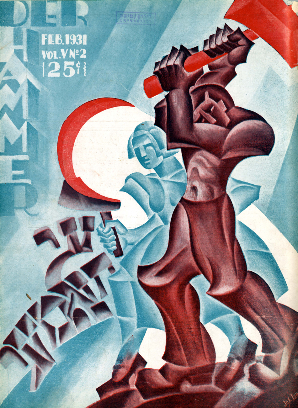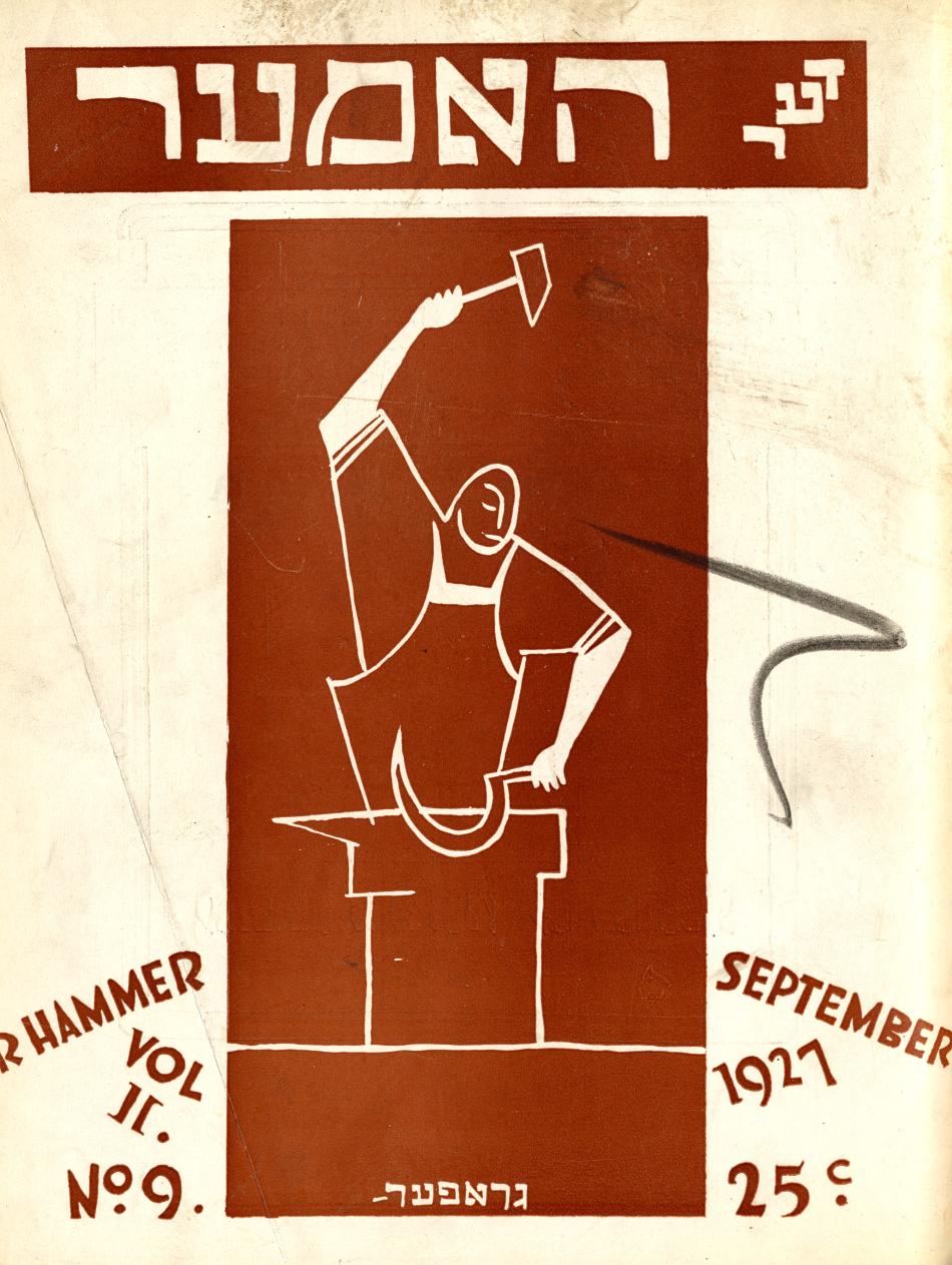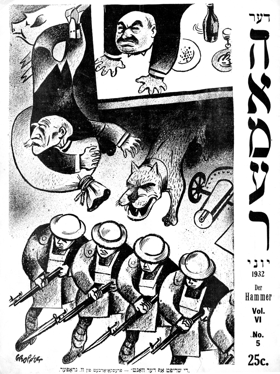 The move further leftward in the Yiddish press coincided with the arrival of new immigrants radicalized by the 1905 uprising in Russia and the pogroms that followed in its wake, as well as the Russian Revolution of 1917, which led directly to the founding of the New York Communist daily Di Morgn Freiheit in 1922 and its monthly magazine  Der hammer (The Hammer). The paper attracted many young Yiddish writers “naturally inclined towards the left and seeking acceptance for fiction and verse more experimental than Abraham Cahan tolerated in the Forward,” as Irwing Howe wrote in World of our Fathers. Progressive writers and artists viewed Der Forverts with an utter contempt, regarding it both as a lowbrow rag, as well as a traitor to the left-wing cause. Though never rivaling the Der Forverts in terms of  circulation, Di Freiheit had the most dedicated audience and was widely regarded as essential reading for those committed to the Soviet Union and the Communist ideology.  It piously followed the Comintern’s diktats and remained loyal to the Kremlin when conflict arose between Jewish and the Communist party interests. With incendiary language and ferocious anti-Zionism and insulting cartoons enthusiastically contributed by such talented artists as William Gropper, Zuni Maud, and Yosel Cutler, the newspaper antagonized many in the Jewish community.