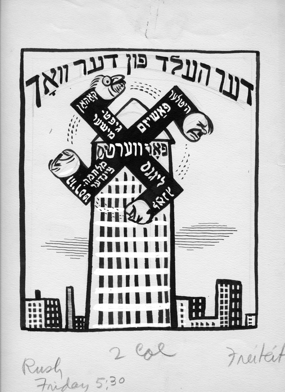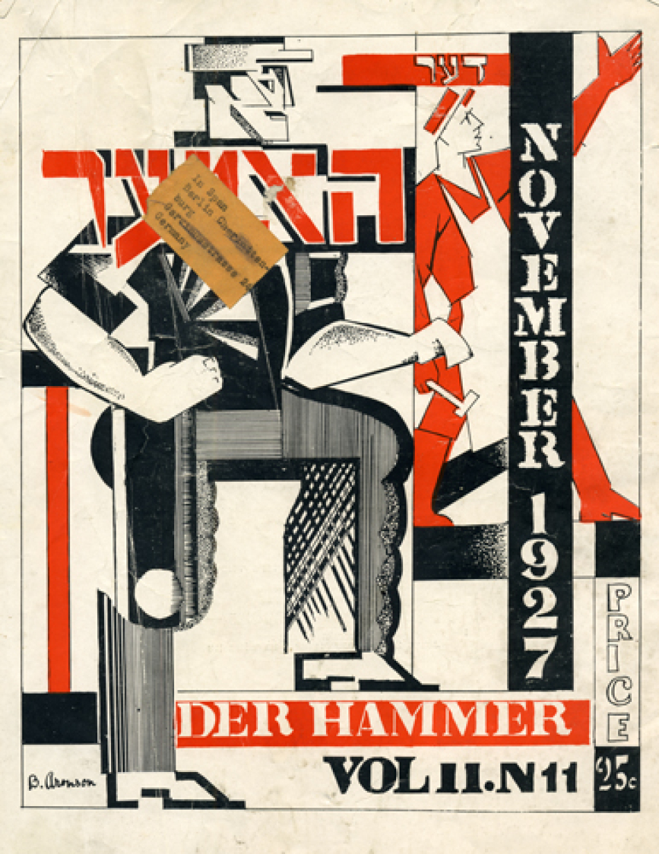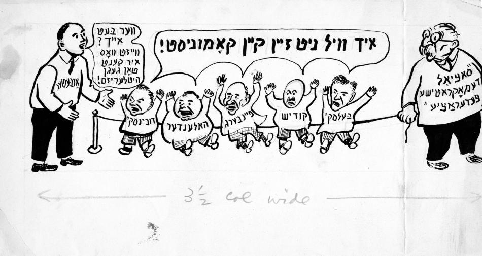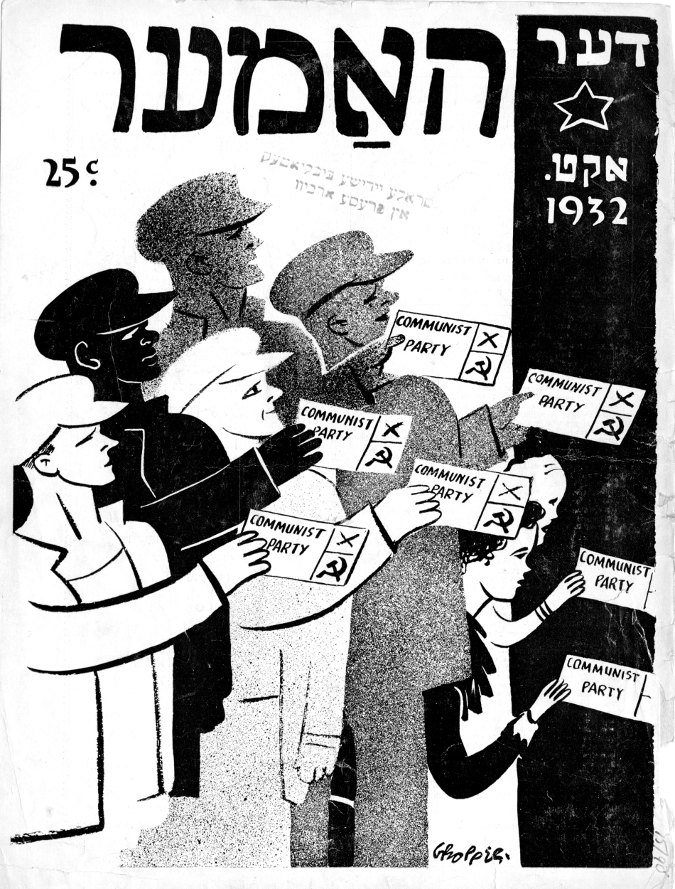 The move further leftward in the Yiddish press coincided with the arrival of new immigrants radicalized by the 1905 uprising in Russia and the pogroms that followed in its wake, as well as the Russian Revolution of 1917, which led directly to the founding of the New York Communist daily Di Morgn Freiheit in 1922 and its monthly magazine  Der hammer (The Hammer). The paper attracted many young Yiddish writers “naturally inclined towards the left and seeking acceptance for fiction and verse more experimental than Abraham Cahan tolerated in the Forward,” as Irwing Howe wrote in World of our Fathers. Progressive writers and artists viewed Der Forverts with an utter contempt, regarding it both as a lowbrow rag, as well as a traitor to the left-wing cause. Though never rivaling the Der Forverts in terms of  circulation, Di Freiheit had the most dedicated audience and was widely regarded as essential reading for those committed to the Soviet Union and the Communist ideology.  It piously followed the Comintern’s diktats and remained loyal to the Kremlin when conflict arose between Jewish and the Communist party interests. With incendiary language and ferocious anti-Zionism and insulting cartoons enthusiastically contributed by such talented artists as William Gropper, Zuni Maud, and Yosel Cutler, the newspaper antagonized many in the Jewish community.