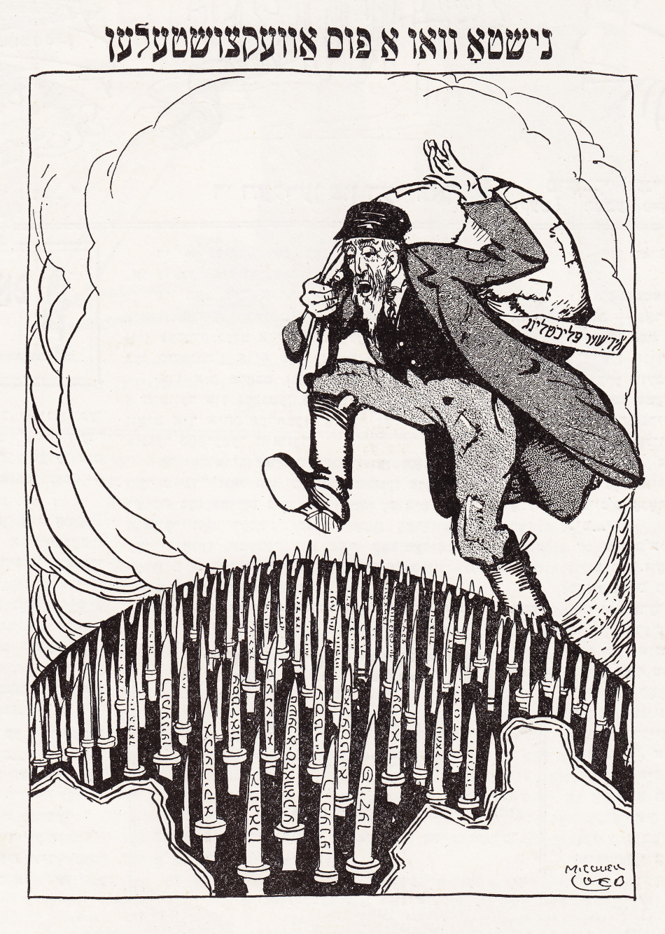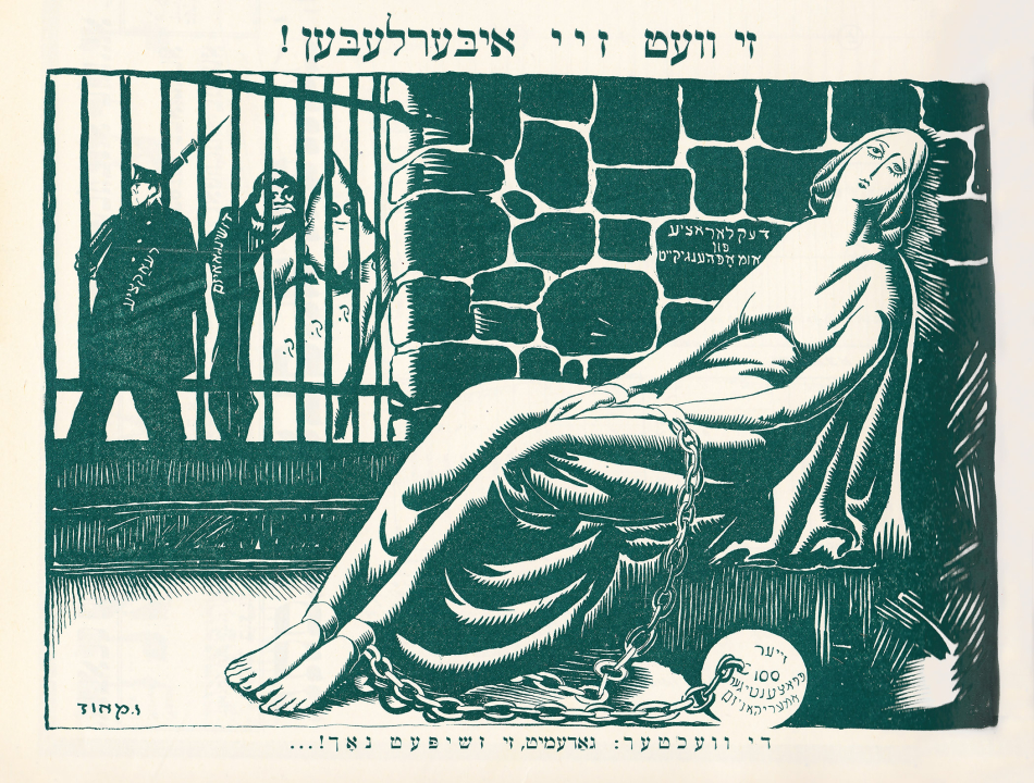 Taking aim with their poison pens, Der groyser kundes, the Lower East Side’s premier Yiddish satire weekly, attacked the Immigration Quota Acts of 1921 and 1924, which were enacted to severely stifle Jewish immigration to the U.S. Well-acquainted with the dire circumstances in which Eastern European Jews found themselves, Yiddish cartoonists understood that a more fair immigration policy would be beneficial to both Jews and to America. Using political, cultural, and traditional Jewish imagery, the artists of Der groyser kundes crafted numerous cartoons that considered the situation from the perspective of a Jewish immigrant community for which the matter was potentially a matter of life and death.