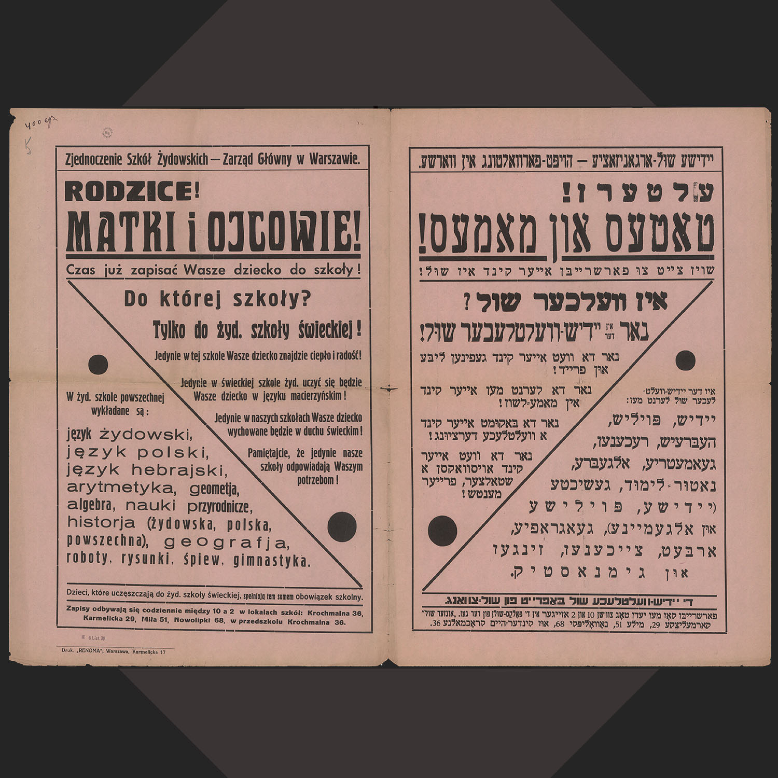 One hundred years ago, the Central Jewish School Organization (TSYSHO) was established in Warsaw, uniting a number of secular Jewish schools and using Yiddish as its language of instruction. A compromise made between different school and community activists associated with various political parties, mostly the Bund, the Left Poale Zion, the Folkspartei and the supporters of democratic school, they shared the same dream – to create a unified, secular school where children from the Yidishe gas, or the Jewish Street, would receive instruction in their native language. The creation of TSYSHO was only the beginning. But the new school organization lacked everything it needed: educated teachers, premises, textbooks and pedagogical literature, even the educational vocabulary required to teach particular subjects in Yiddish. It also had no money and did not even have the right to exist. All of the above had to be fought for, and this was the role of TsYSHO, and precisely what the party's activists did during the nearly twenty years of its existence in Poland.
