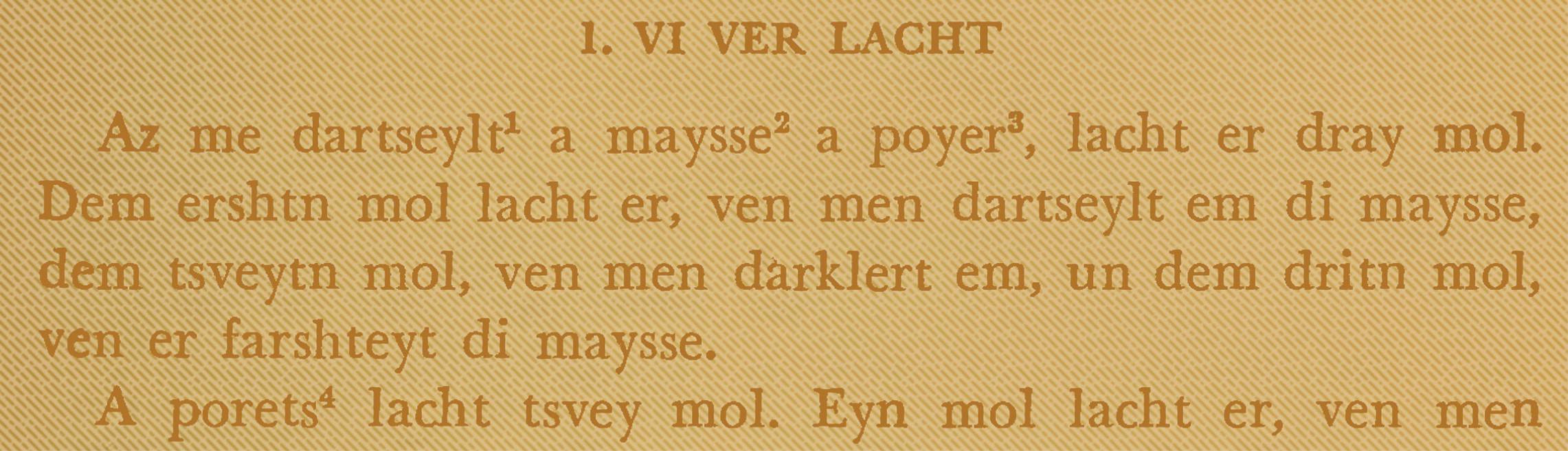 It was printed in dialect—not in literary Yiddish, not even in the Yiddish alphabet—by publishers not accustomed to issuing Yiddish-language works. Yet it is an authentic and extremely reliable reflection of Yiddish language and lore. In this mini-course we will review the history of the book's compilation and publication, enjoy some of its better and its lesser known jokes, discuss what can be learned from it about spoken Yiddish and about the specific dialect in which it's presented, and review how the collection has been used by others. Towards the eternal attempt to characterize Yiddish humor, we will discuss the motifs that are joked about and Olshvanger's theory of what is essential to the Yiddish joke.