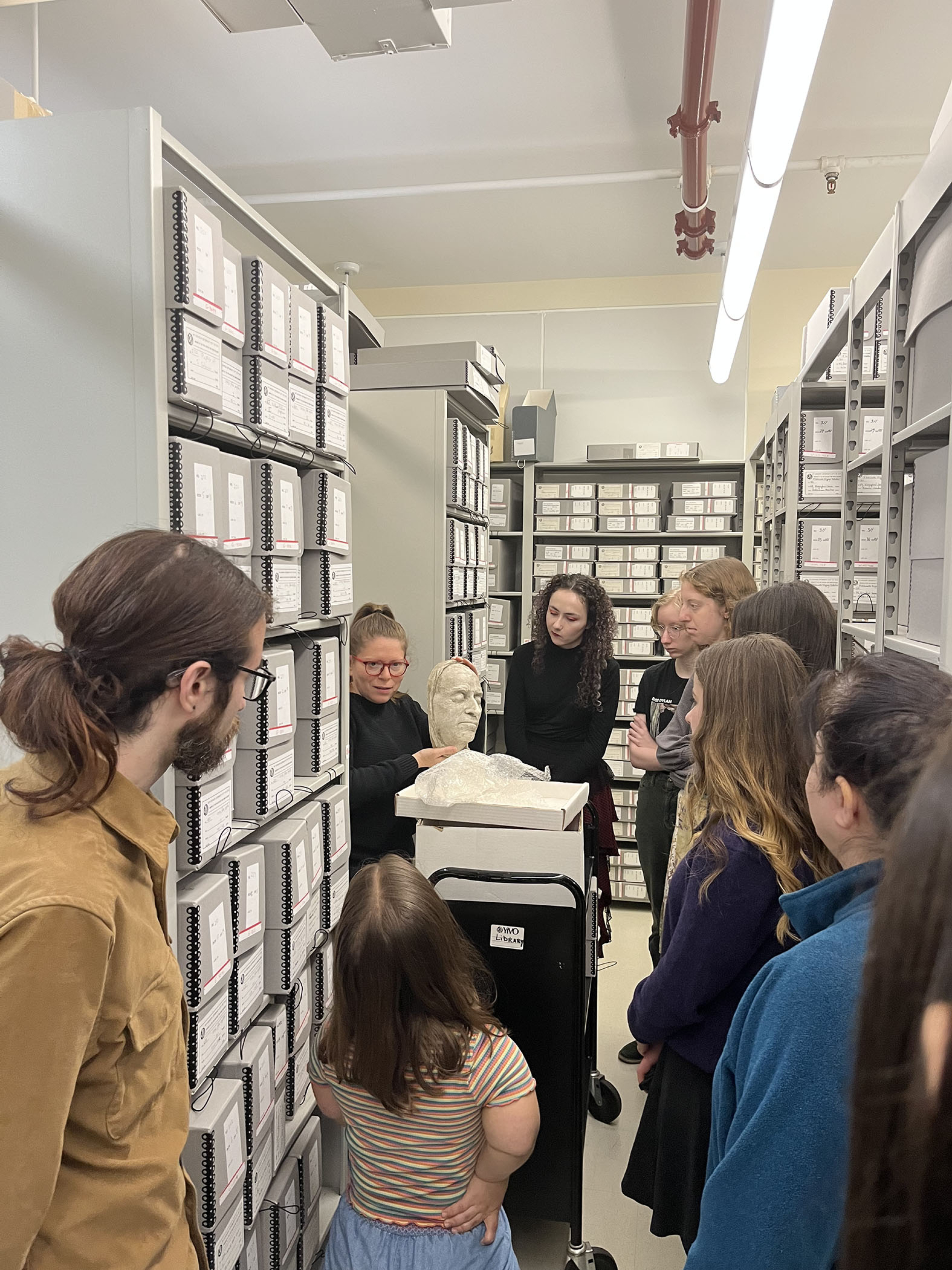 On November 17, YIVO hosted a beginner Yiddish language class from Columbia University. The class was brought to YIVO by Graduate Instructor Ethan Fraenkel, an alum of YIVO’s Uriel Weinreich Summer Program. During their visit, the group was given a presentation about YIVO’s history, a tour of archival stacks led by Halpern, and a chance to peruse the YLMC’s archival lesson kits. During the last section, they tested their Yiddish knowledge by trying to read the archival reproductions in their original Yiddish.