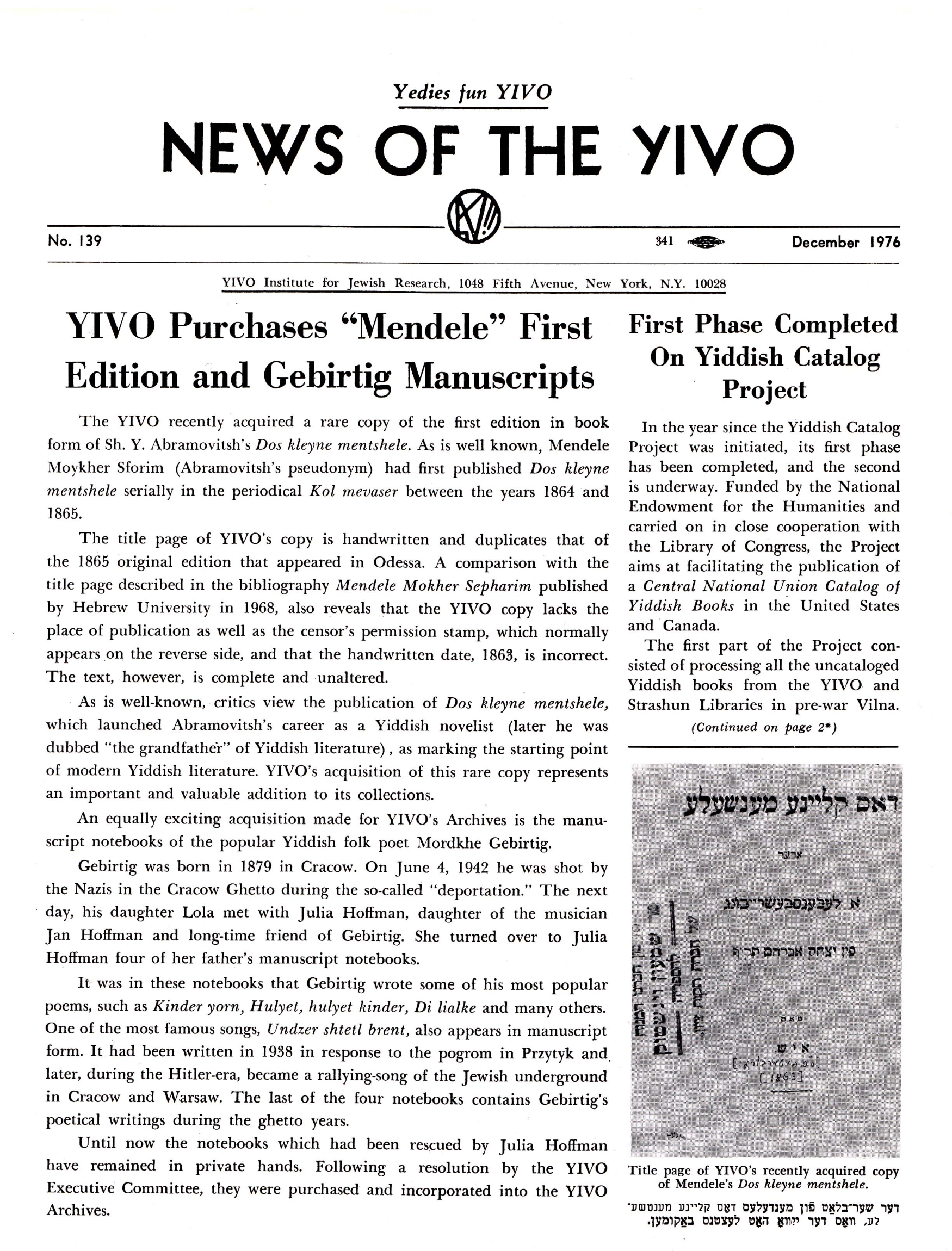 The December 1976 edition of Yedies announces the acquisition of a rare first edition of Dos kleyne mentshele, a book by Mendele Moykher Sforim that marks “the starting point of modern Yiddish literature.” The same article announces the purchase of the manuscript notebooks of Mordechai Gebirtig, a folk song composer who died in the Krakow Ghetto. His song Under shtetl brent (Our town is burning) became an anthem of the Jewish anti-Nazi resistance in Krakow and Warsaw.
