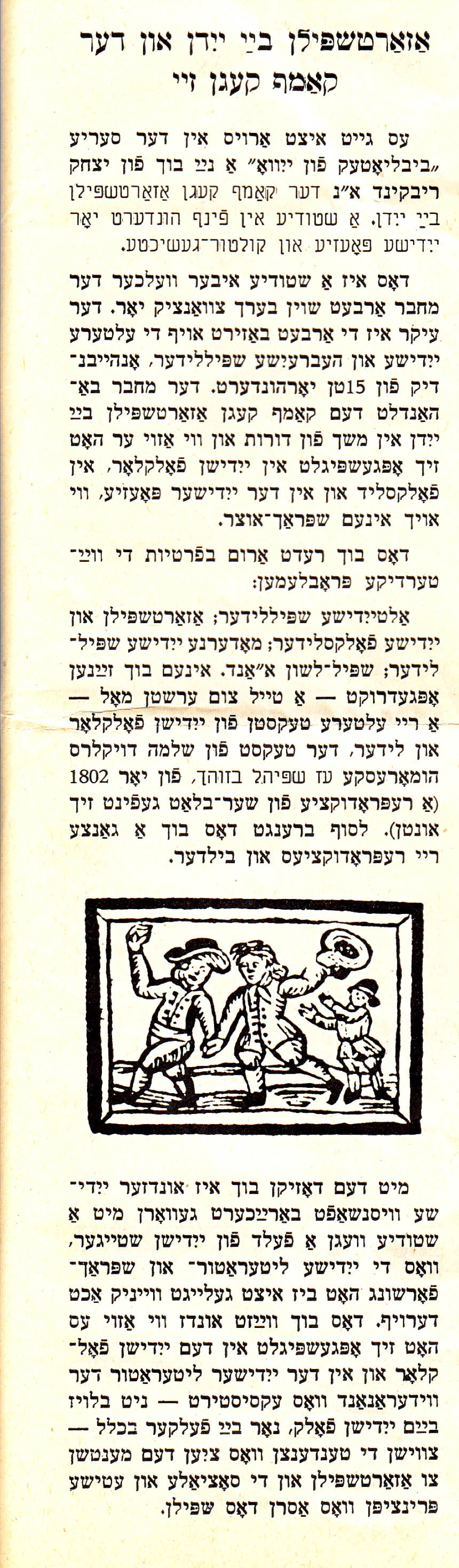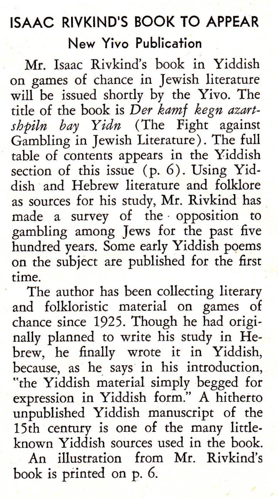 In April 1946, Yedies reported on the publication of Isaac Rivkind’s Der kamf kegn azartshpiln bay Yidn (The fight against gambling in Jewish literature). The Yiddish version of the article is more detailed, providing a list of topics covered by the book: