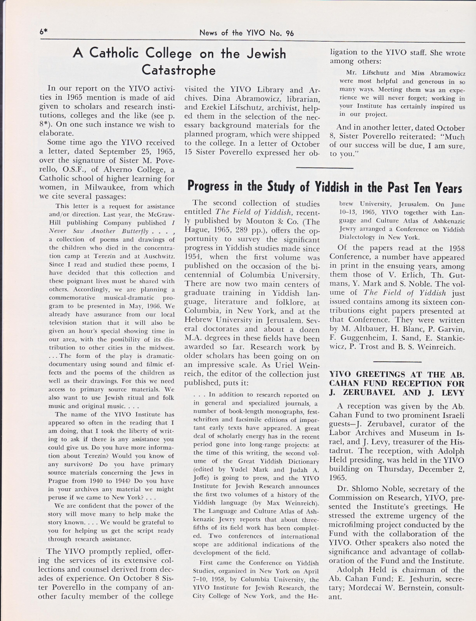 In 1964, I Never Saw Another Butterfly, an anthology of poems and drawings by children in the Terezin (Theresienstadt) Concentration Camp, appeared in English translation (McGraw Hill). This Yedies article from December 1965 reports on a trip to YIVO by nuns from a Catholic school for women in Milwaukee who were engaged in creating a play based on the book.