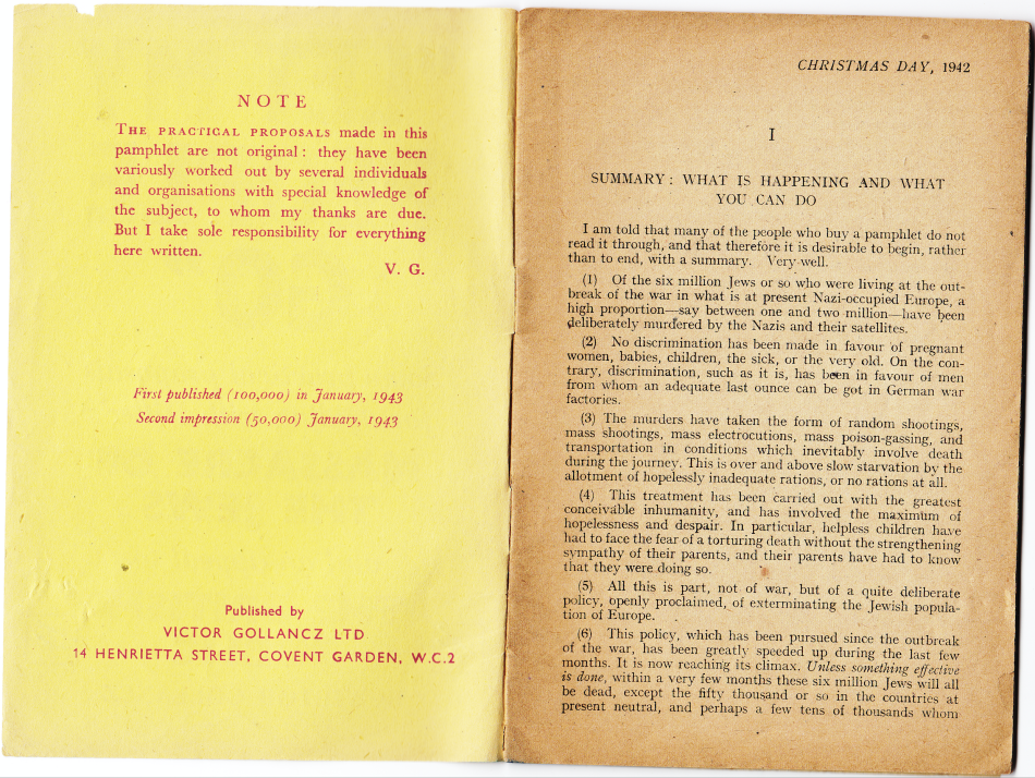 This pamphlet, a best-seller for his publishing house, was a call to action. It described Nazi atrocities and the mass murder of Jews, and readers were urged to write to their representatives in Parliament to demand that immigration regulations should be relaxed for Jewish refugees and that “the boldest possible measures of rescue adopted.”
